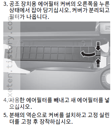 에어필터를 직접 교체하려면 다음의 방법을 따르십시오. 이때 다른 부품이 손상되지 않도록 주의하십시오.