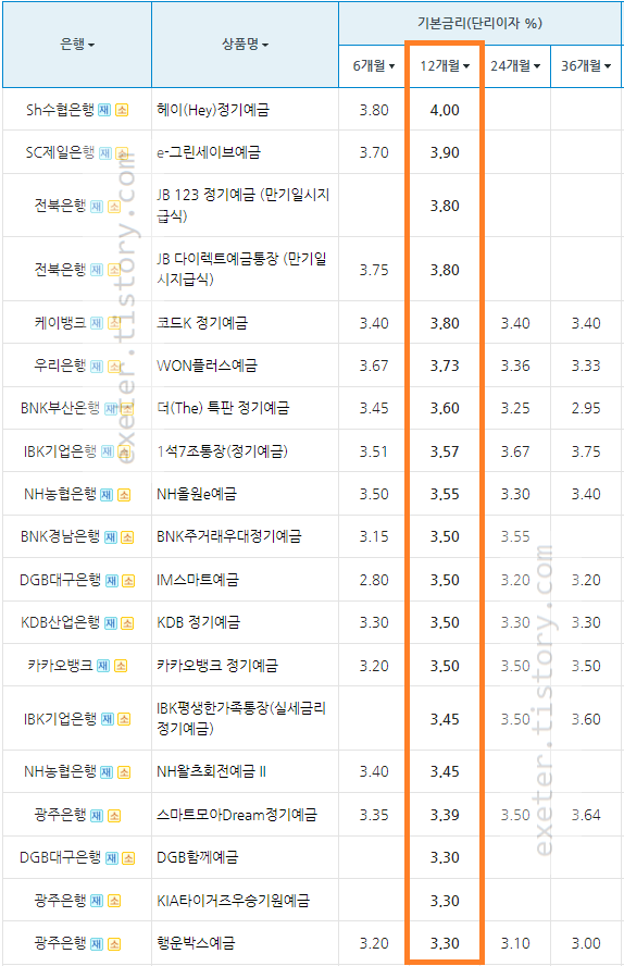 은행 / 상품명 / 기본금리 (단리 이자(%), 12개월 기준)