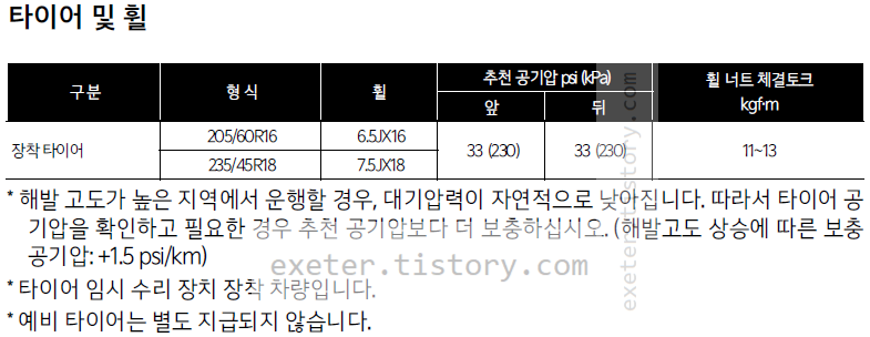 • 해발 고도가 높은 지역에서 운행할 경우 대기 압력이 자연적으로 낮아집니다. 따라서 타이어 공기압을 확인하고 필요한 경우 추천 공기압보다 더 보충하십시오. (해발 고도 상승에 따른 보충 공기압: +1.5 psi/ km)