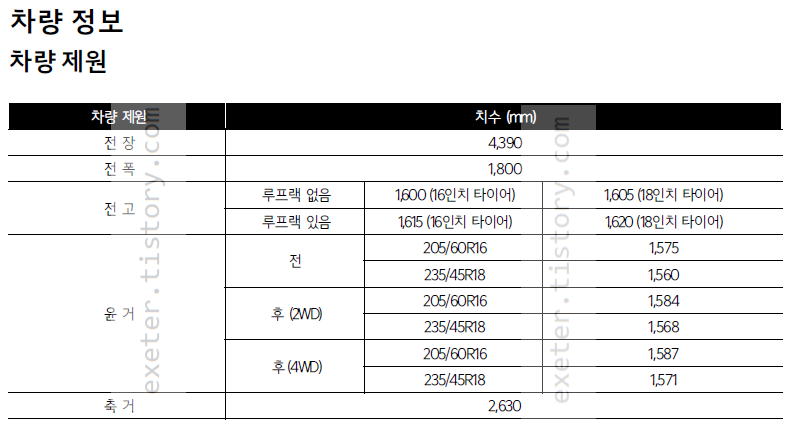 전고: 1605 mm (루프랙 미장착 / 18인치 타이어 기준)