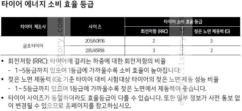 *타이어 순정 사이즈 및 에너지 소비 효율 등급(젖은노면 제동력)은 아래 그림 참고