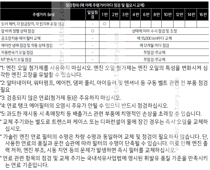 * 연료 관련 항목의 점검 및 교체 주기는 국내석유사업법에 명시된 휘발유 품질 기준을 만족시키는 연료 기준입니다.