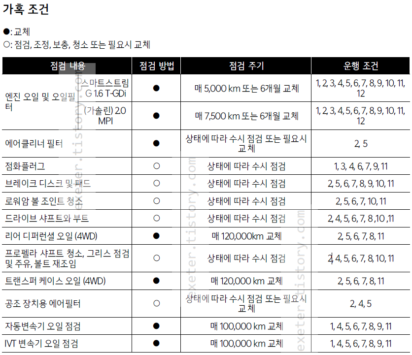 차량 사용 설명서에서는 '가혹 조건'인 경우 교환/점검 주기를 빠르게 가져가도록 안내하고 있습니다.