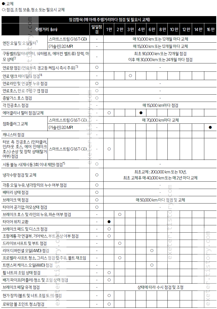 - 엔진 오일 및 오일필터*1 (G1.6 T-GDi): 매 10,000km 또는 12개월마다 교체