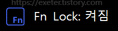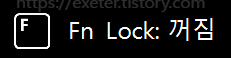 펑션락 키는 보통 키보드 우측 최상단에 존재하는데, 삼성 노트북의 경우 (일반적으로 기본 설정 상태에서) 아래와 같이 펑션락 키를 누를 때마다 켜짐/꺼짐 상태를 보여줍니다. 또는 삼성 노트북 외에도 이러한 표시를 화면에 보여주거나, 키보드에 Fn Lock LED 표시가 존재하는 경우도 있습니다.