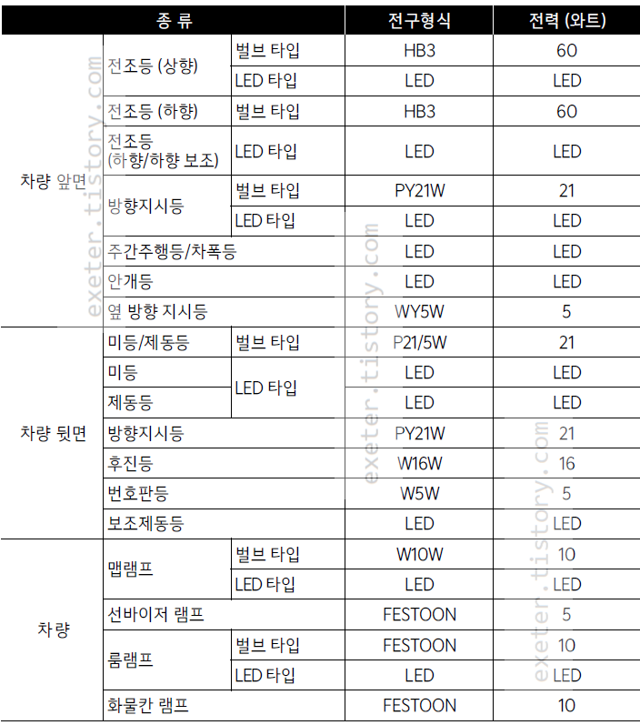 2023 셀토스 전조등, 미등, 제동등, 램프 전구형식 및 전력은 아래 그림을 참조하세요.