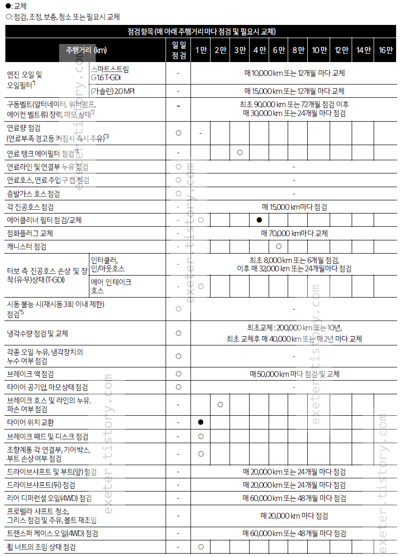 - 엔진 오일 및 오일필터*1 (G1.6 T-GDi): 매 10,000km 또는 12개월마다 교체