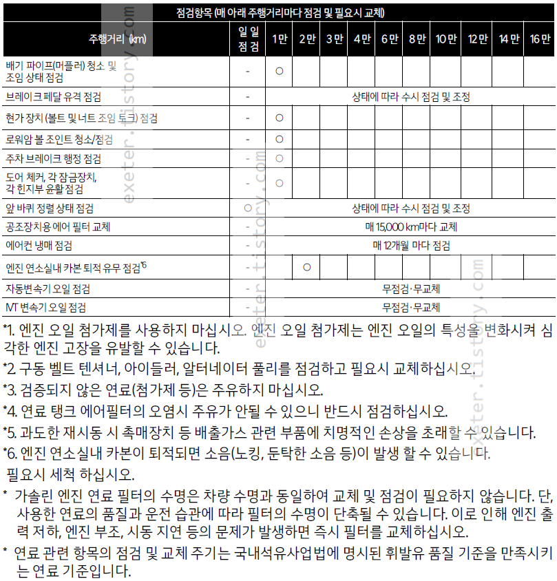 * 연료 관련 항목의 점검 및 교체 주기는 국내석유사업법에 명시된 휘발유 품질 기준을 만족시키는 연료 기준입니다.