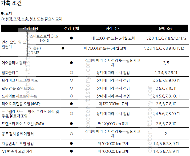 예를 들어 가혹 조건인 경우에는 가솔린 터보 1.6 엔진 오일은 '매 5000 Km 또는 6개월' 마다 교체로 안내하고 있습니다. 가혹 조건인 경우 일반적인 운행조건 대비 점검/교체 주기가 더 짧습니다.