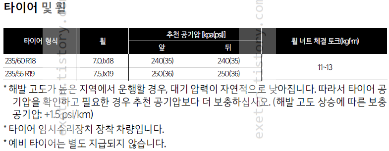타이어 추천 공기압: 240 kPa (35 psi) *18인치