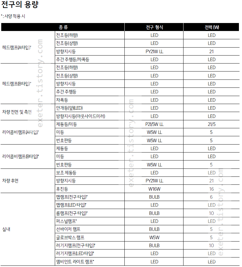 2023 카니발 전조등, 미등, 제동등, 램프 전구형식 및 전력(와트) 목록은 아래 그림을 참조하세요.
