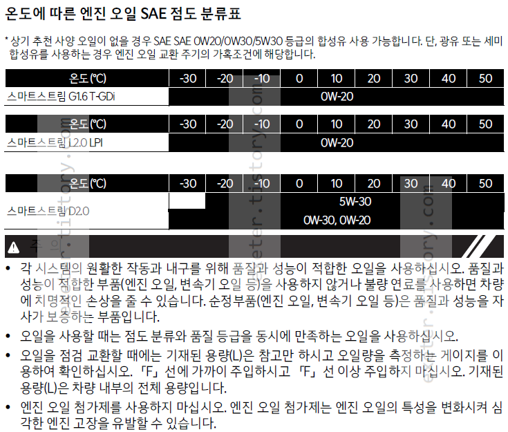*1. 상기 추천 사양 오일이 없을 경우 SAE 0W20/0W30/5W30 등급의 합성유를 사용할 수 있습니다. 단, 광유 또는