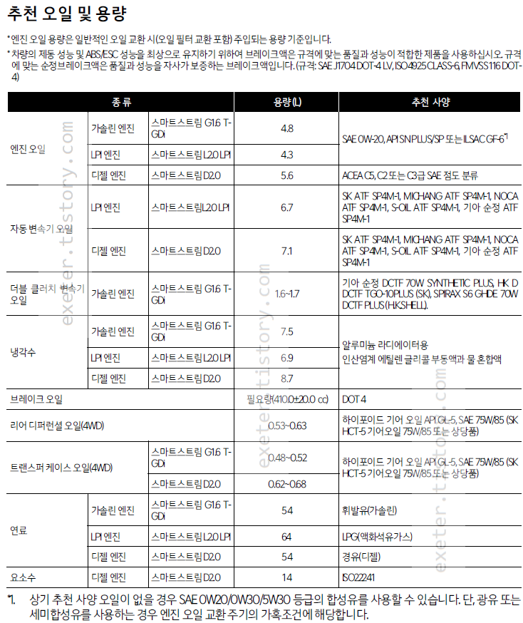 - 엔진 오일 (가솔린 / G1.6 T-GDi): 4.8 리터 (SAE 0W-20, API SN PLUS/SP 또는 ILSAC GF-6 *1)