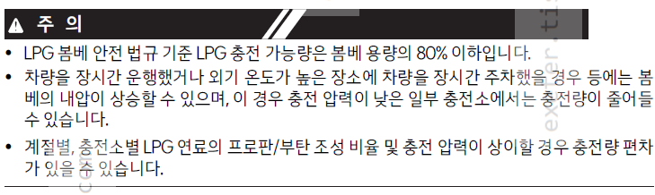 - 계절별, 충전소별 LPG 연료의 프로판/부탄 조성 비율 및 충전 압력이 상이할 경우 충전량 편차가 있을 수 있습니다.