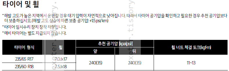 • 해발 고도가 높은 지역에서 운행할 경우 대기 압력이 자연적으로 낮아집니다. 따라서 타이어 공기압을 확인하고 필요한 경우 추천 공기압보다 더 보충하십시오. (해발 고도 상승에 따른 보충 공기압: +1.5 psi/ km)
