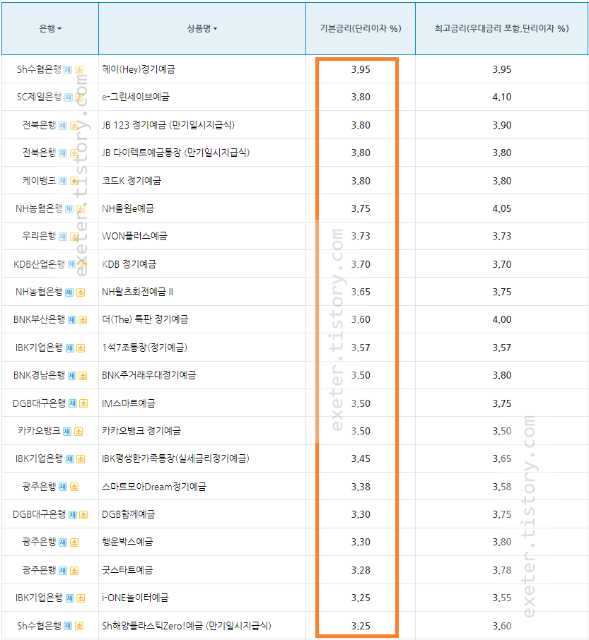 작성일 2023년 8월 1일 기준, 정기예금 기본 금리가 높은 순서로 상위 10개는 아래와 같습니다.