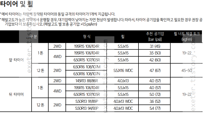 1톤(2WD) 추천 공기압 (앞): 3.1 bar (45 psi)