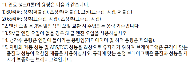 * 2. 엔진 오일 용량은 일반적인 오일 교환 시 주입되는 용량 기준입니다.