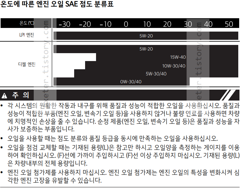 *오일을 사용할 때는 점도 분류와 품질 등급을 동시에 만족하는 오일을 사용하십시오.