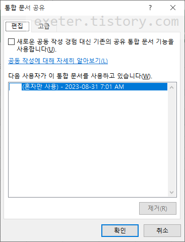 2. [편집] 탭에서 '새로운 공동 작성 경험 대신 기존의 공유 통합 문서 기능을 사용합니다.' 체크 해제.