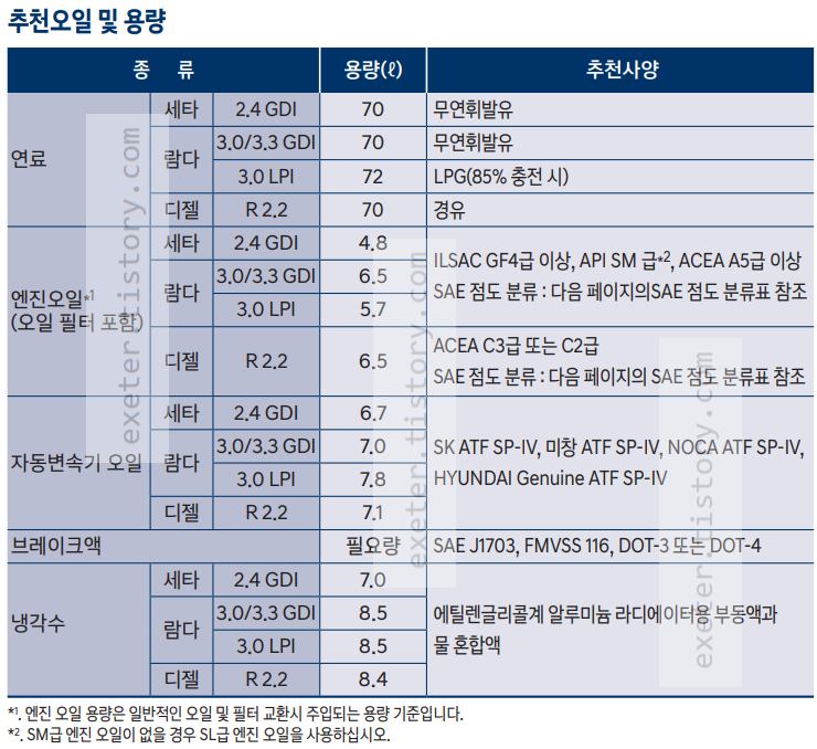 - 엔진오일(세타 2.4GDI) : 4.8 리터 (ILSAC GF4급 이상, API SM 급*2, ACEA A5급 이상)