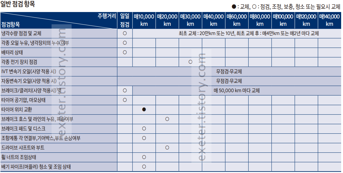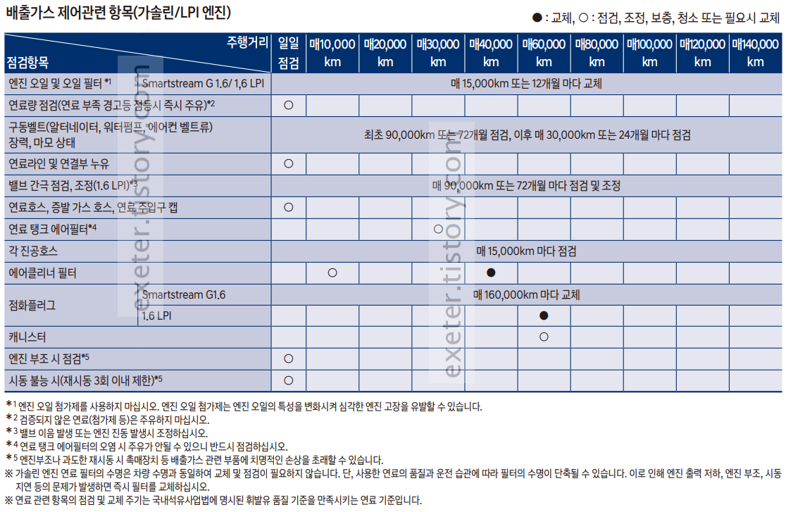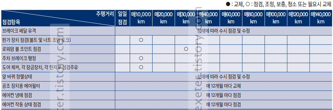 - 에어클리너 필터: 매 10,000 km 점검 및 40,000km 마다 교체