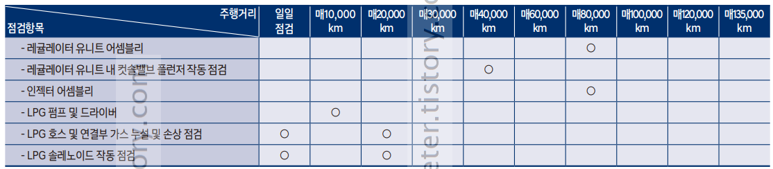 - 밸브 간극 점검, 조정(1.6 LPI)*2: 매 90,000km 또는 72개월 마다 점검 및 조정