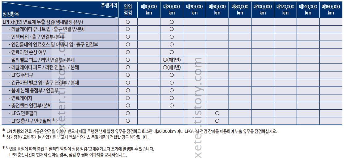 ※ 연료 관련 항목의 점검 및 교체 주기는 국내석유사업법에 명시된 휘발유 품질 기준을 만족시키는 연료 기준입니다.