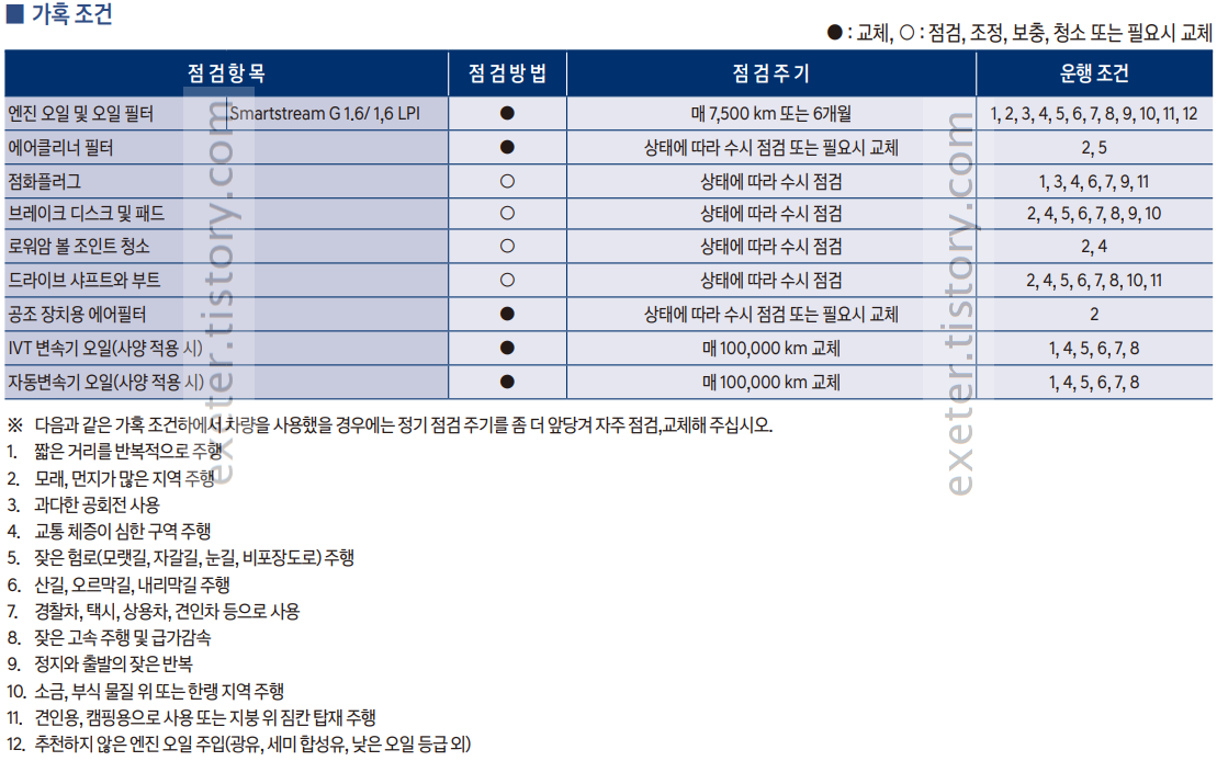 차량 사용 설명서에서는 '가혹 조건'인 경우 교환/점검 주기를 빠르게 가져가도록 안내하고 있습니다.