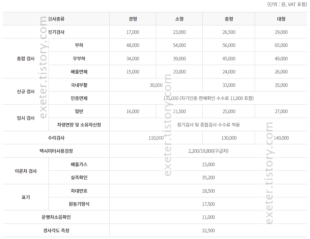 - - 검사수수료는 한국교통안전공단 기준 금액이며, 지정정비사업자는 공단과 다를 수 있습니다.