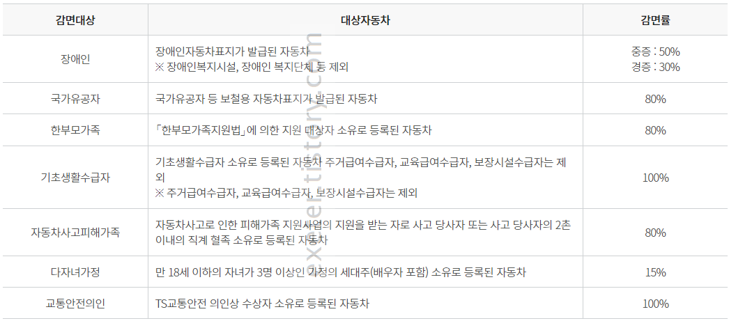 한국교통안전공단 자동차검사소에서는 사회공헌활동의 일환으로, 사회적약자를 대상으로 정기검사 및 종합검사시 정상수수료의 일정비율을 감면해드립니다.(기타 감면사항과 합산 또는 중복되어 적용하지 않습니다.)