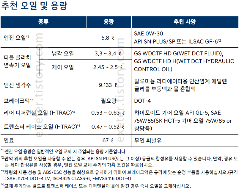- 더블 클러치 변속기 오일(냉각 오일): 3.3 ~ 3.4 리터 (GS WDCTF HD G(WET DCT FLUID))