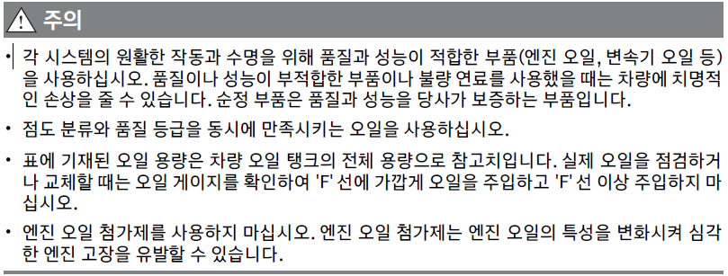 *1 : 엔진 오일 용량은 일반적인 오일 교체시 주입되는 용량 기준입니다.