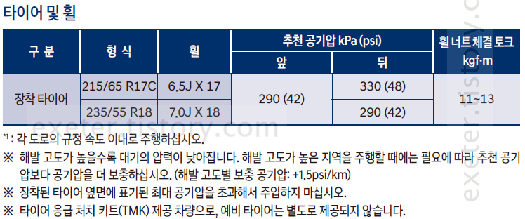 타이어 추천 공기압 (R18 / R20): 240 kPa (35 psi)