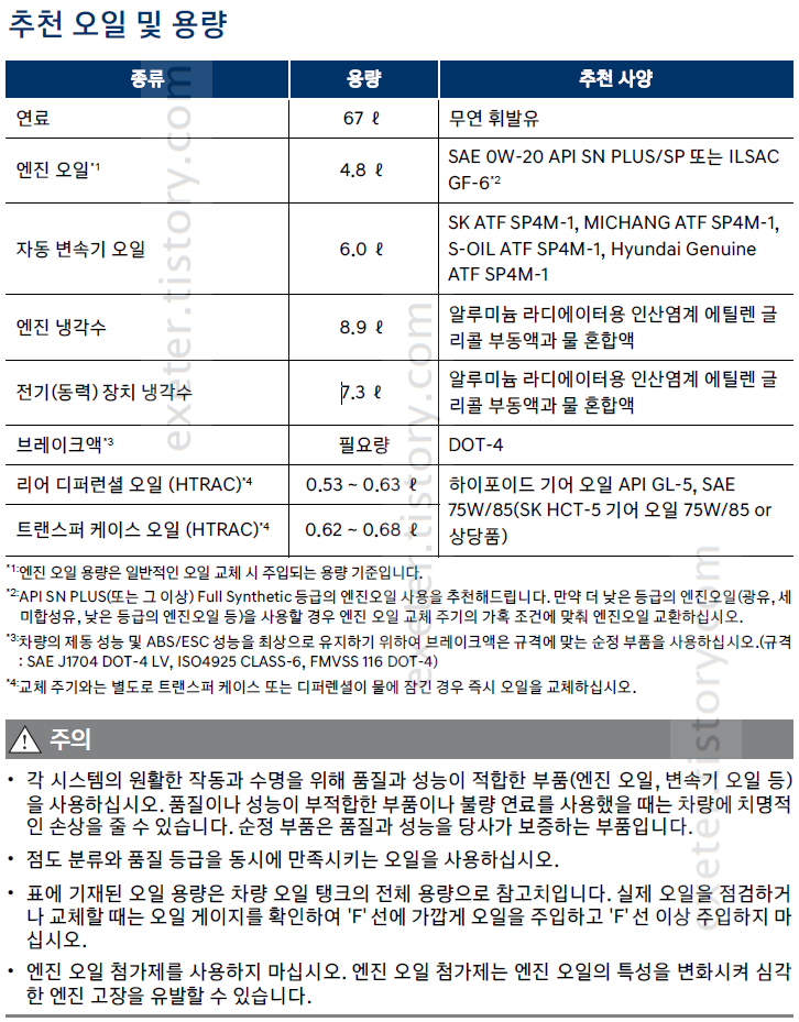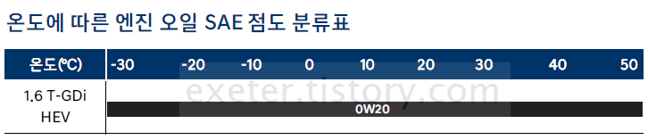 - 엔진오일(1.6 T-GDi HEV) 점도: 0W-20
