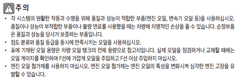 - 엔진오일(D2.0) 점도: 10W-30/40 , 5W-30/40 , 0W-20/30/40