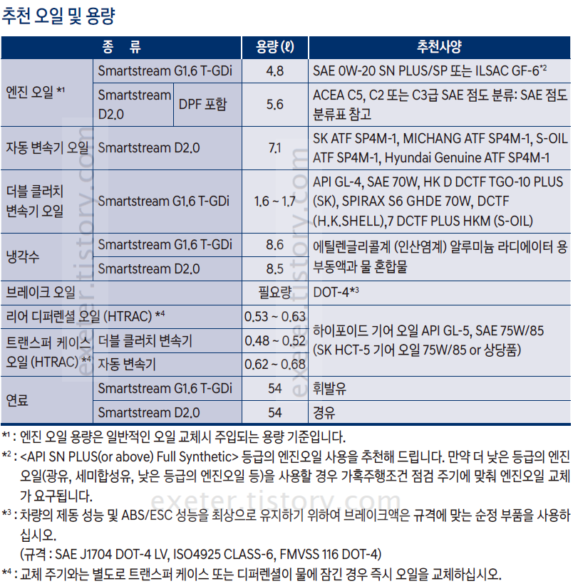 - 엔진 오일*1 (G1.6 T-GDi): 4.8 리터 (SAE 0W-20 SN PLUS/SP 또는 ILSAC GF-6 *2)