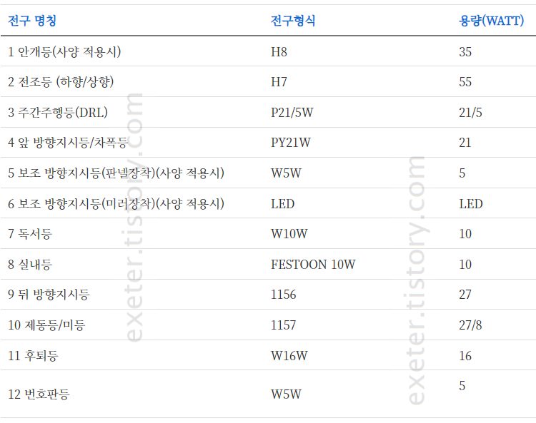 | 3 주간주행등(DRL) | P21/5W | 21/5 |