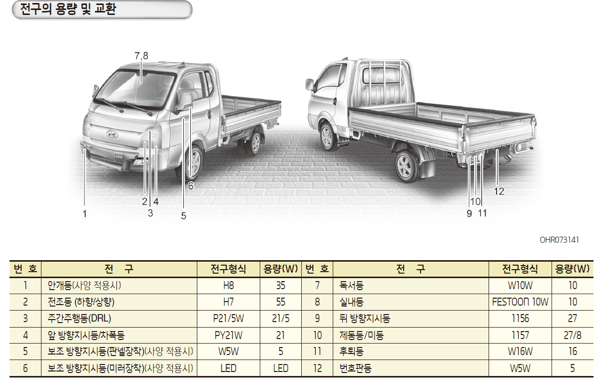 참고: 2023 년식 포터(디젤) 및 2024 포터(LPG)의 전구 용량 및 형식은 동일하게 표시되어 있습니다