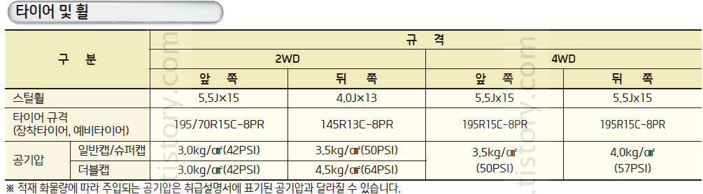 - 타이어 추천 공기압(4WD 앞): 3.5kg/㎠ (50PSI)