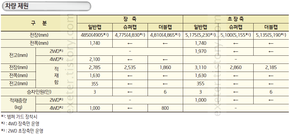 초장축 및 더블캡/일반캡 차량 치수제원은 아래 표를 참고 바랍니다.
