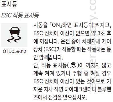 단, 작동 표시등이 꺼지지 않고계속 켜져 있거나 주행 중 켜질 경우 ESC 장치에 이상이 있는 것이므로 가까운 자사 직영 하이테크센터나 블루핸즈에서 점검을 받으십시오.