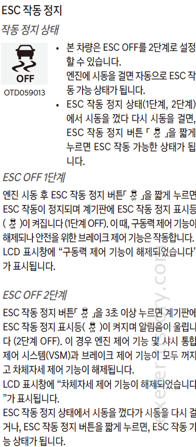 주행 중 ESC 작동 가능 상태에서 작동 정지 상태로변환시키고자 할 때에는 직선 평탄로에서 정속 주행을 하며 ESC 작동 정지 버튼을 누르십시오.