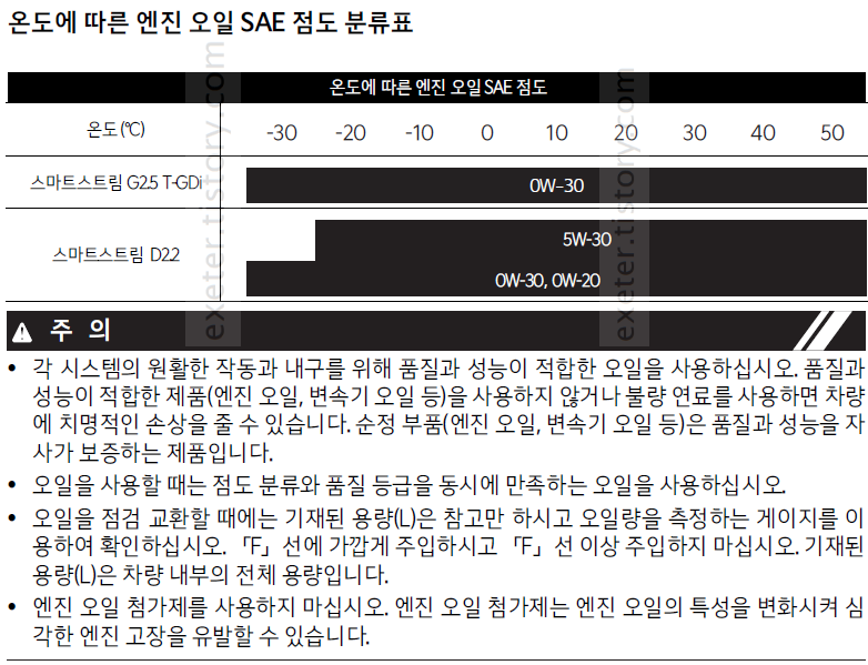 아래는 2024 쏘렌토 매뉴얼에서 발췌한 '온도에 따른 엔진 오일 SAE 점도 분류표'입니다.