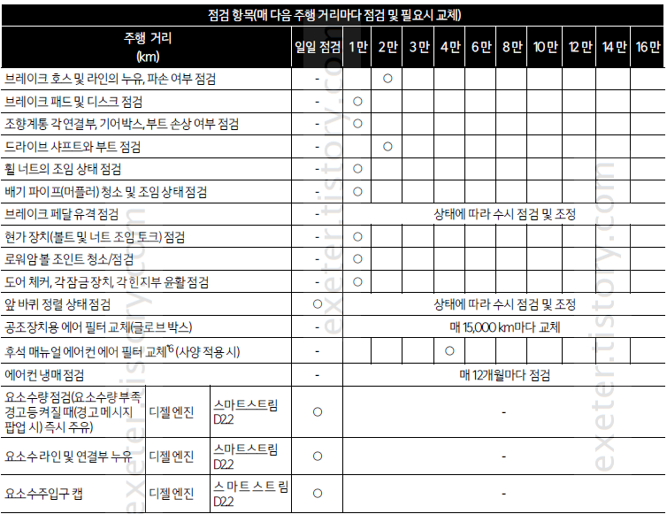 - 엔진 오일 및 오일필터 (디젤 D2.2): 매 20,000km 또는 12개월마다 교체