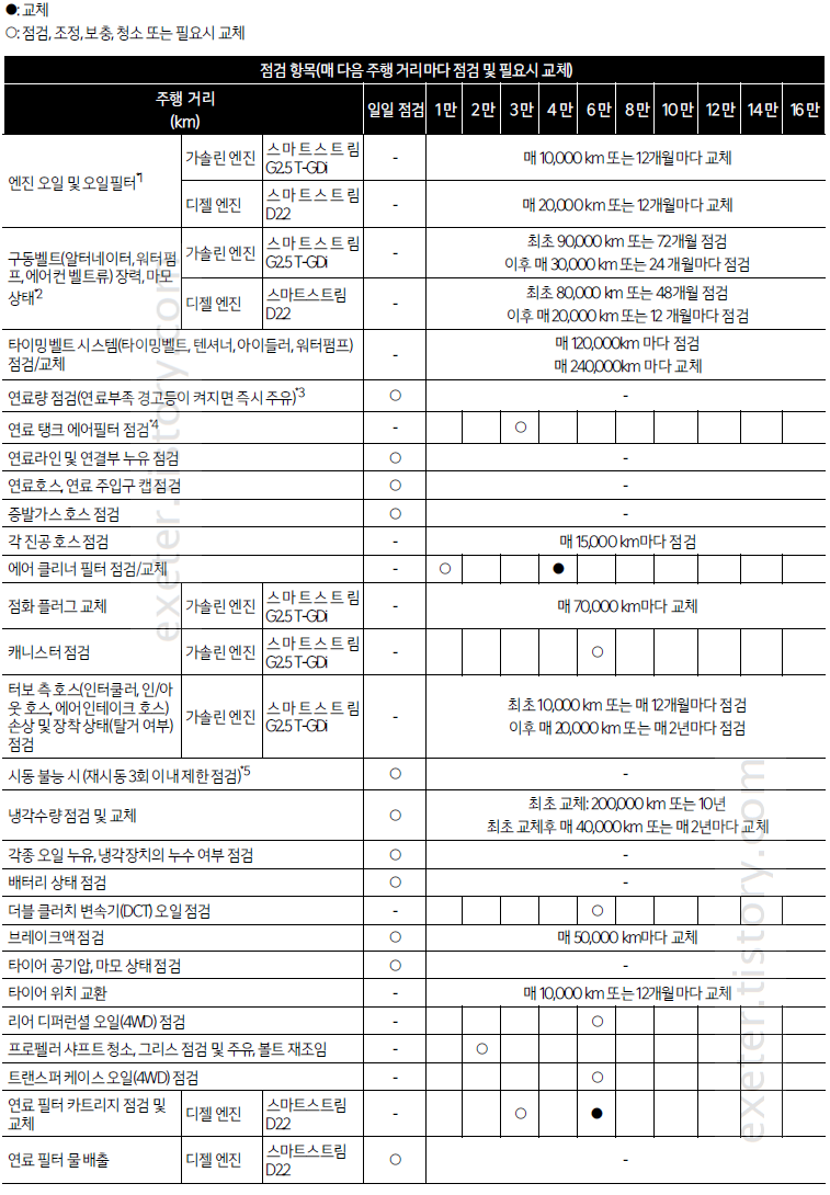* 연료 관련 항목의 점검 및 교체 주기는 국내석유사업법에 명시된 경유/휘발유 품질 기준을 만족 시키는 연료 기준입니다.