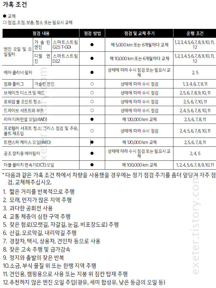 가혹 조건인 경우 일반적인 운행조건 대비 점검/교체 주기가 더 짧습니다.