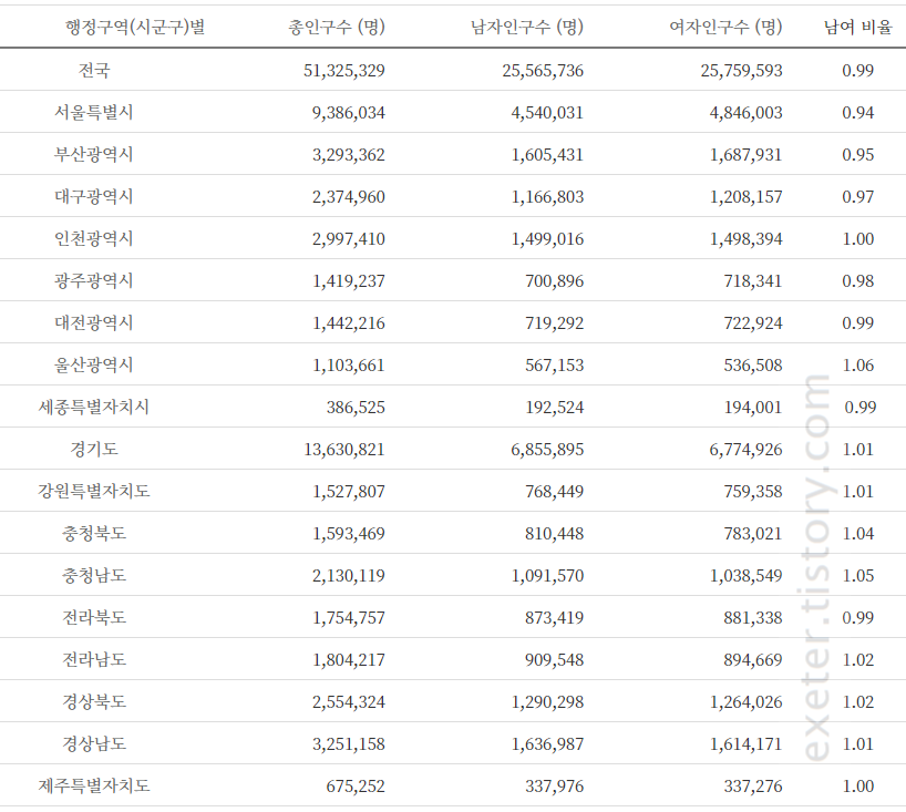 | 전국 | 51,325,329 | 25,565,736 | 25,759,593 | 0.99 |