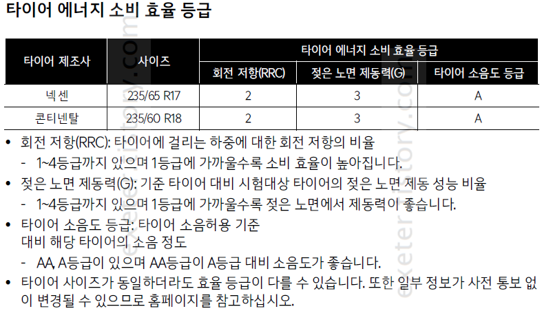 *타이어 순정 사이즈 및 에너지 소비 효율 등급(젖은노면 제동력)은 아래 그림 참고