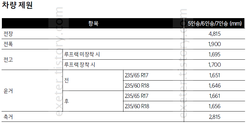 <2024 쏘렌토 치수 제원 - 5인승/6인승/7인승>